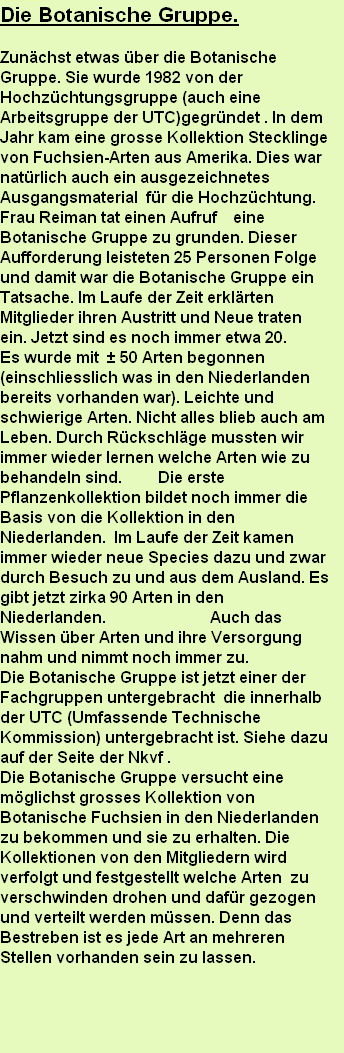 First something about the Botanical Group. It was founded in 1982 out of the Improvement Group (also a part of UTC). That year a big collection of cuttings of Fuchsia species came from the USA. That was also wonderful material for Improvement.
